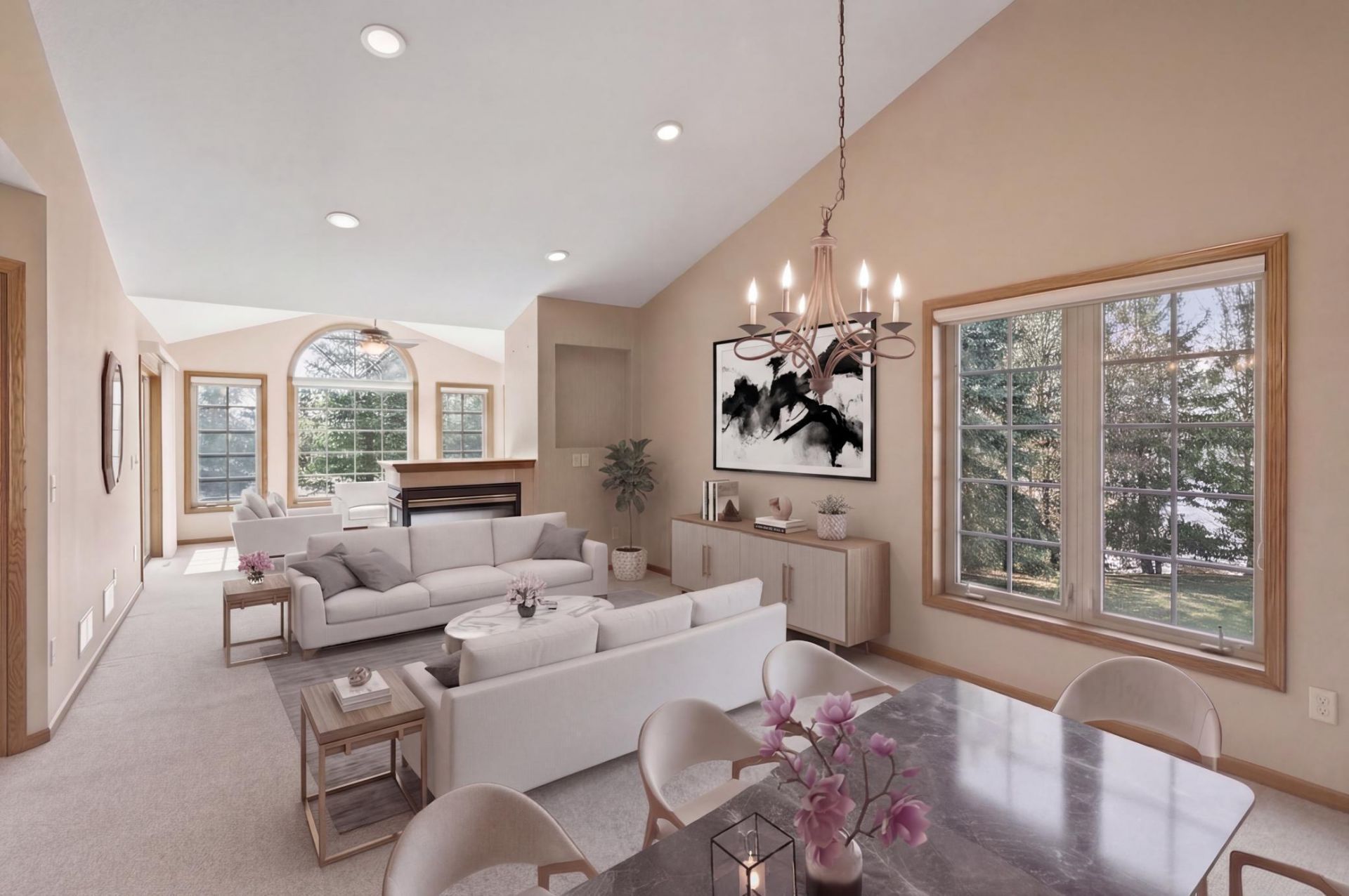 Wonderful opportunity to enjoy one level, maintenance-free living in the sought after Wynstone neighborhood of Eden Prairie. Offering a spacious open floor plan within a private, 24-unit, self-managed development with common area pond, wildlife area and Gazebo. The main level features an inviting great room with dramatic vaulted ceiling and two-sided gas fireplace, nicely updated kitchen with dinette, primary bedroom, office/den, laundry room, and a lovely sunroom that offers convenient access to the maintenance-free deck. The generous primary bedroom with walk-in closet and private bathroom with separate soaking tub, walk-in shower, and dual vanity. The finished walkout lower level provides a great space to entertain with its spacious family room, two additional bedrooms, bathroom, oversized storage/utility room, and large covered patio that overlooks the beautiful backyard. A very convenient location provides easy access to walking/bike trails, parks, shopping, dining, grocery, coffee, library, community center and major highways. Move-in and enjoy a little piece of paradise.